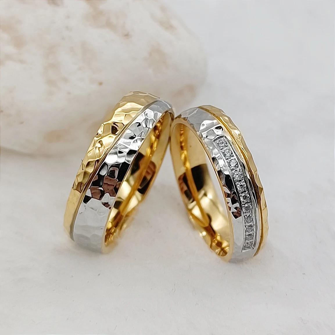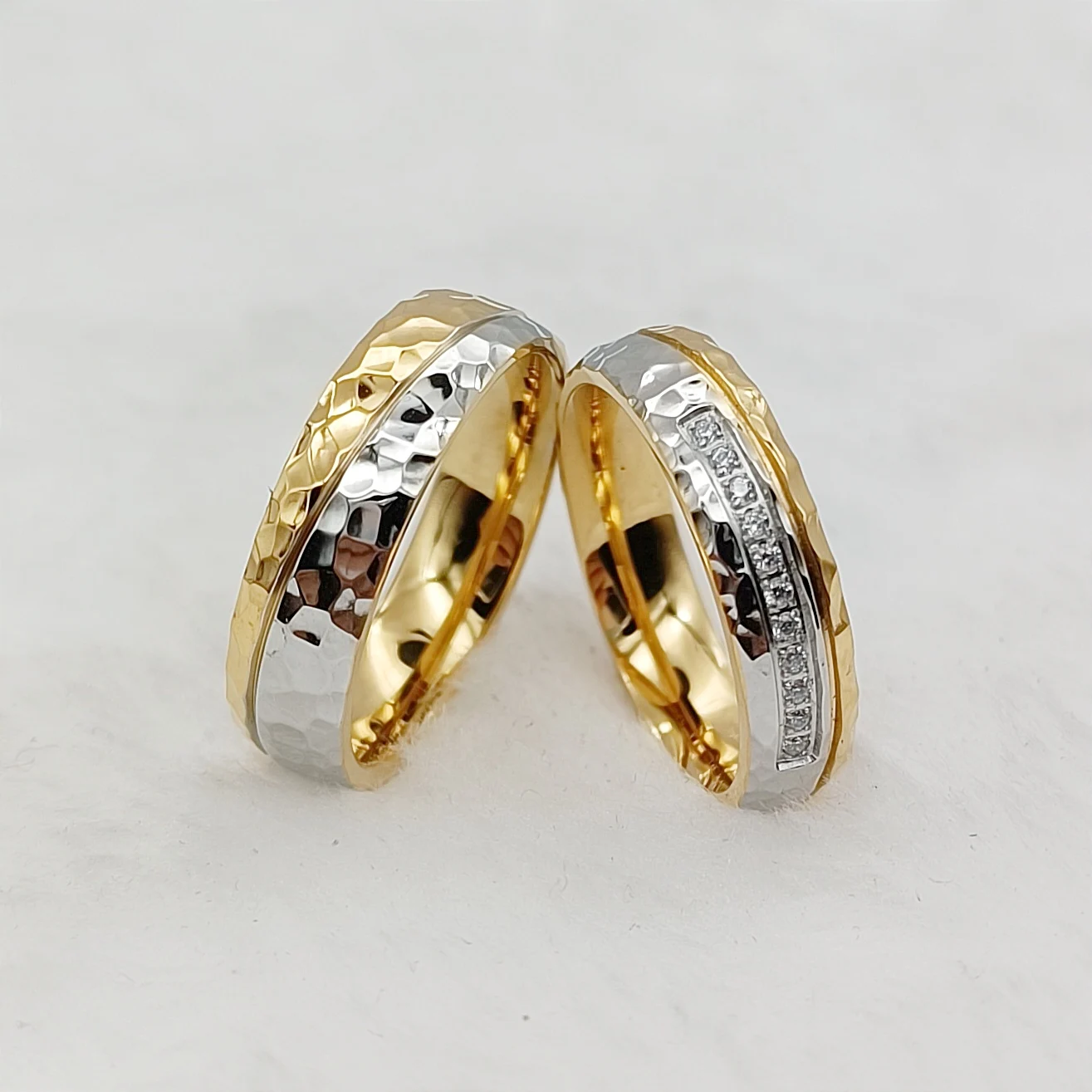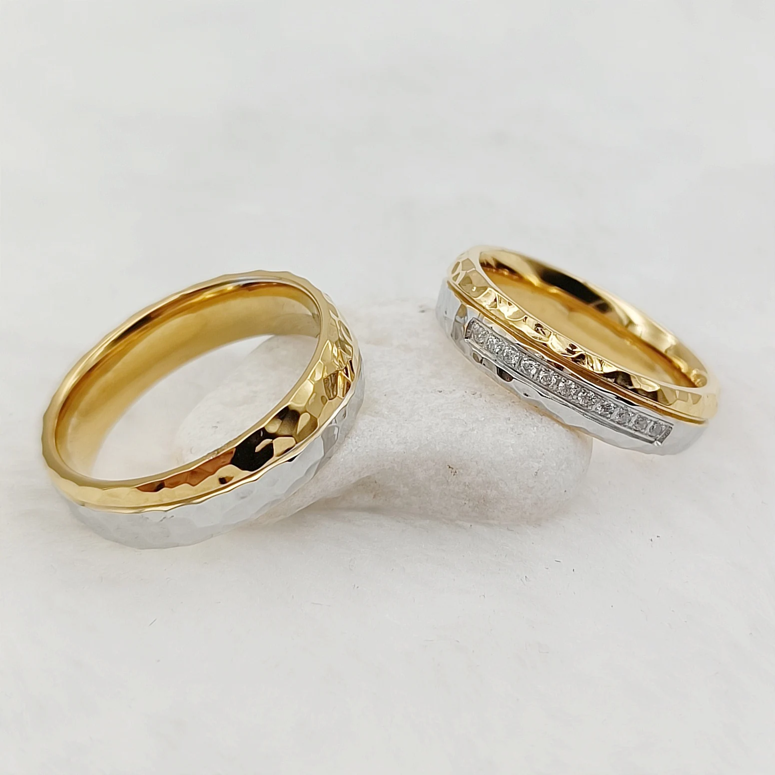 The women’s ring features AAA Hearts & Arrows cubic zirconia, mimicking the brilliance of a real diamond, while the men’s ring showcases a sleek hammered texture for a bold, masculine look. These rings are not only fashionable but also hypoallergenic, scratch-resistant, waterproof, and tarnish-free, ensuring long-lasting wear.