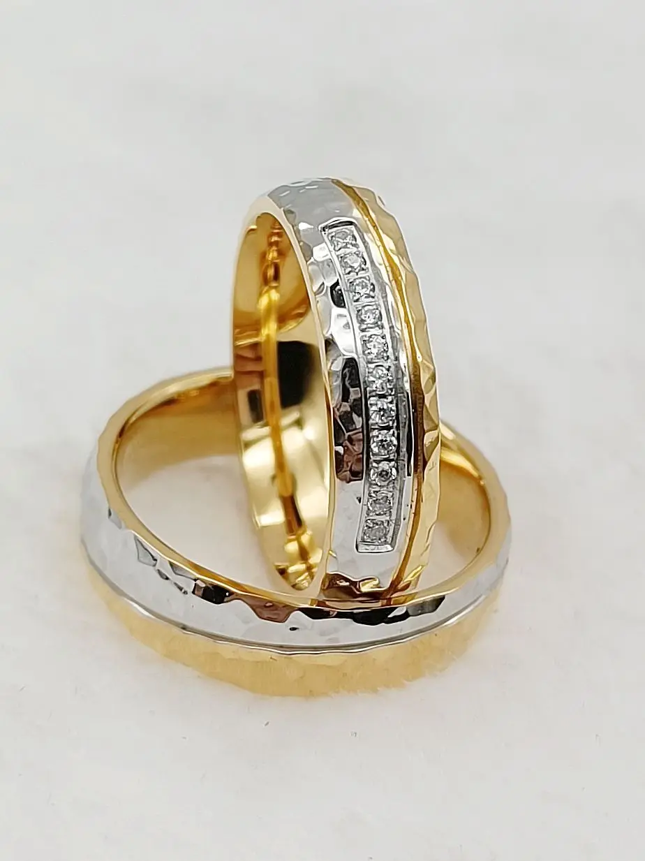 Design: Hammered texture on men’s ring; sparkling CZ stone on women’s