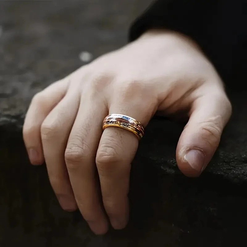 Strum the chords of style with this unique 8mm Gold Color Stainless Steel Guitar String Ring for men. Inspired by the intricate design of guitar strings, this wedding band features a simulated amber stone inlay that adds warm, natural tones to the bold metal finish. Perfect for musicians, music lovers, or anyone who appreciates distinctive jewelry, this ring blends craftsmanship with personality.