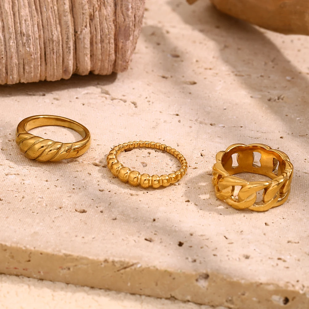 Discover timeless elegance with the E.B.belle Geometric Bridal Ring Set, a stunning piece of jewelry that blends modern design with exceptional craftsmanship. Made from high-quality 316L stainless steel and finished with luxurious 18K gold plating, this ring set features a bold geometric design that captures the essence of contemporary style. The set includes rings with surface widths of 4mm, 6mm, and 9mm, allowing for a customizable fit and layering effect to suit your unique style.