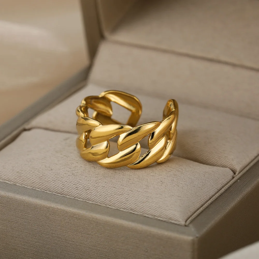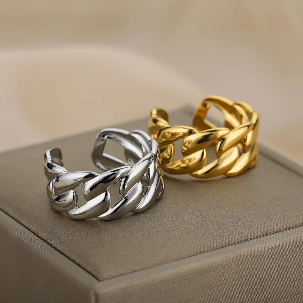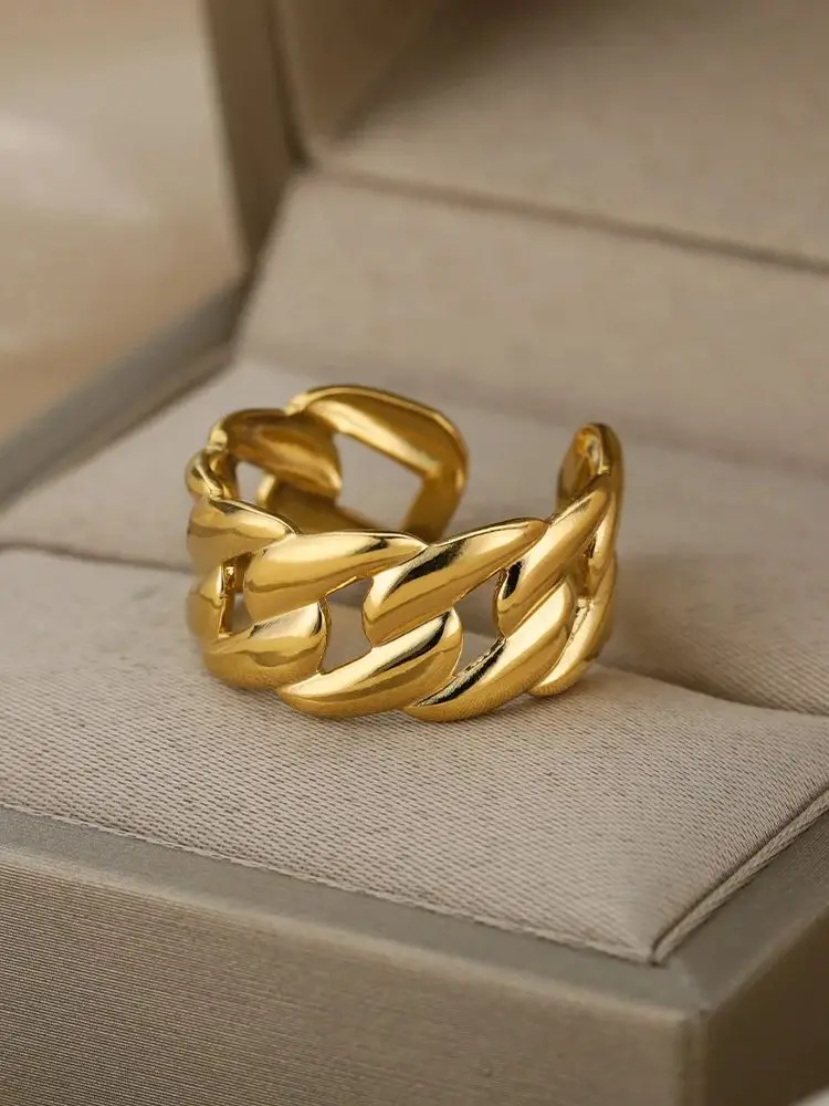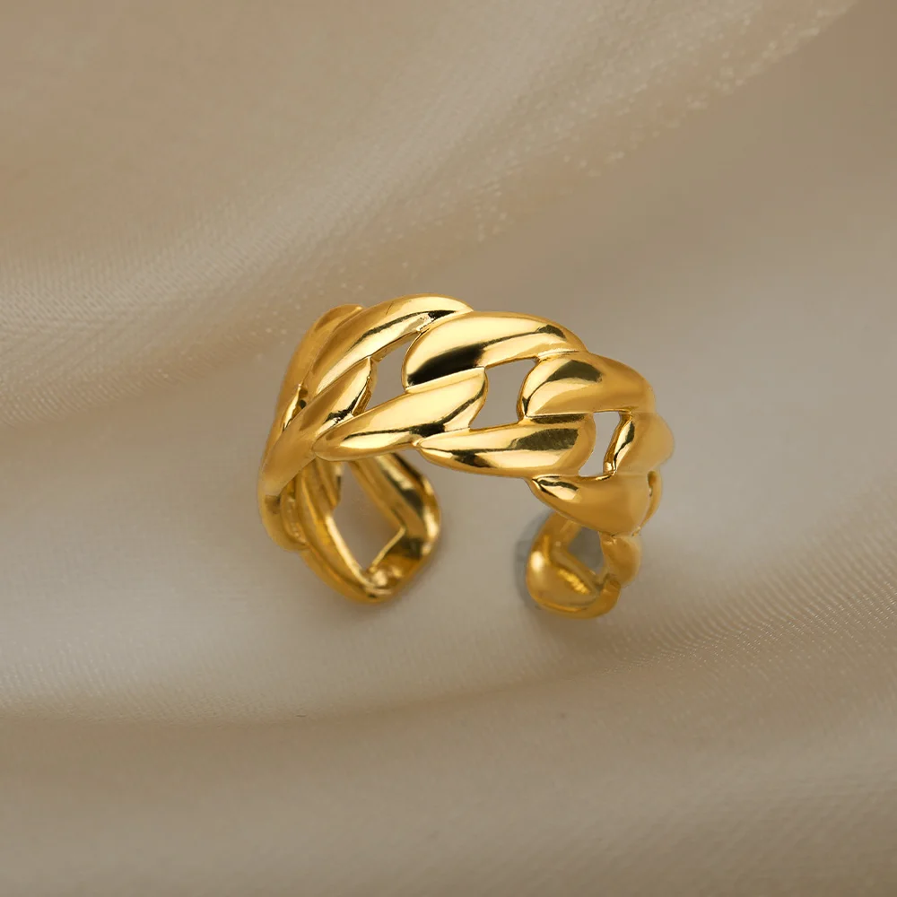 Celebrate timeless connection with this Stainless Steel Cuban Chain Ring, a trendy unisex wedding band designed for couples who love vintage-inspired style with modern durability. Featuring a classic Cuban chain pattern and finished with luxurious 18K gold plating, this open ring combines elegance with everyday wearability.