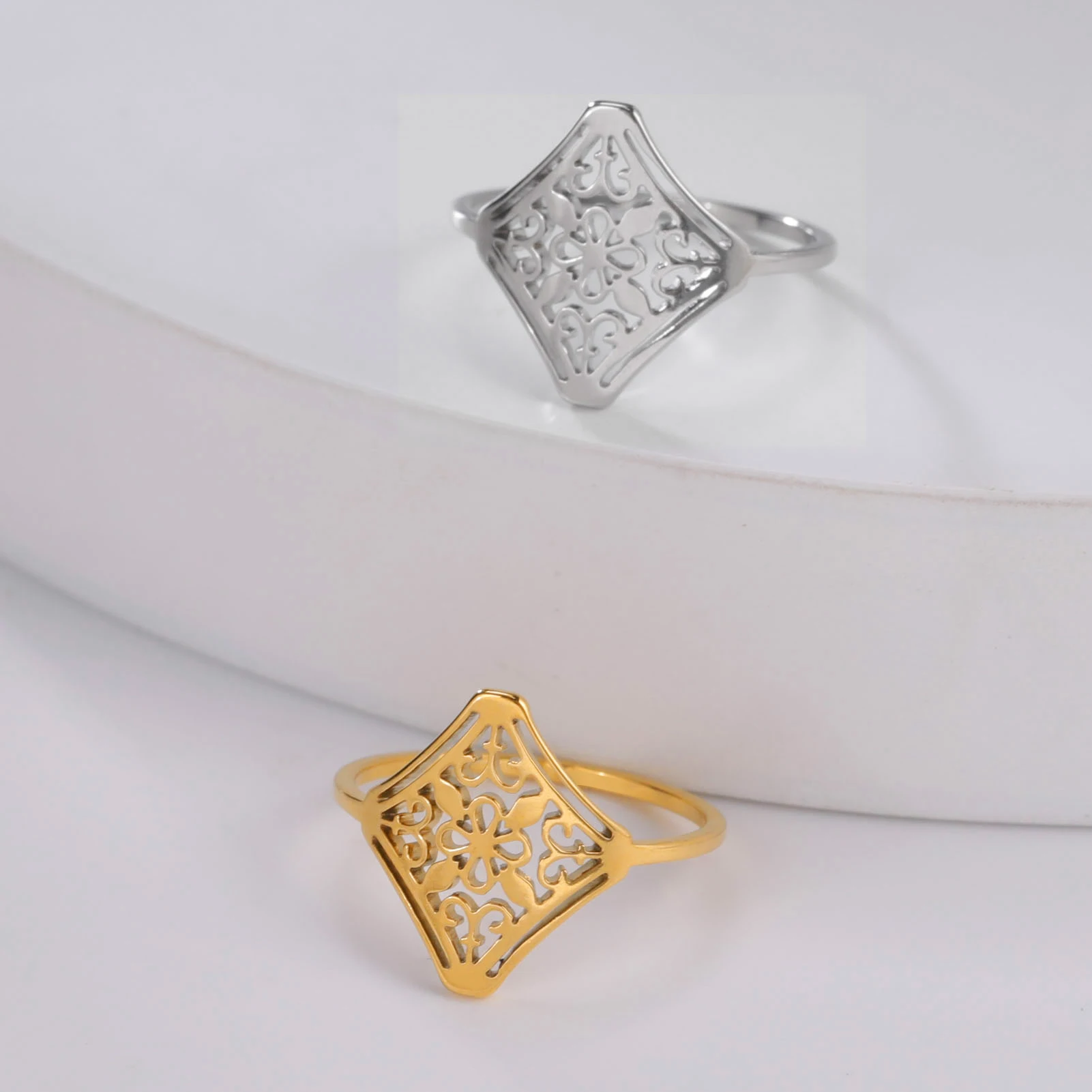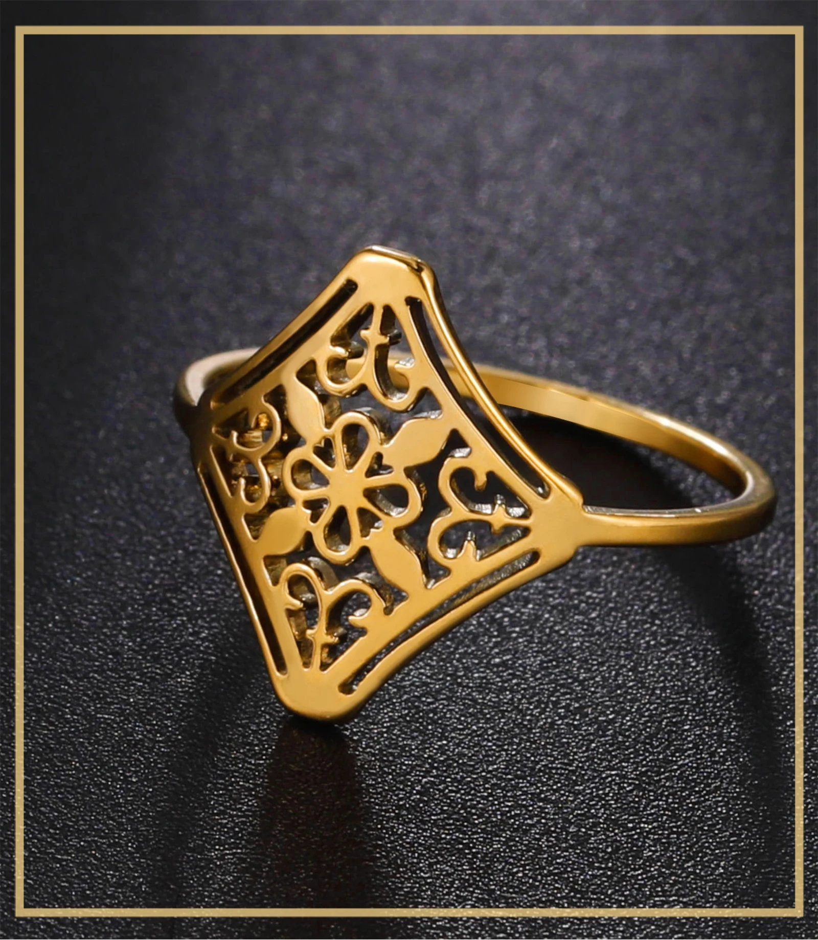 Elevate your everyday elegance with this Vintage Filigree Flower Ring for women, crafted from high-quality stainless steel and plated in luxurious 18K gold. Featuring a refined geometric floral filigree design, this trendy ring brings timeless charm and modern durability together in one stunning piece.