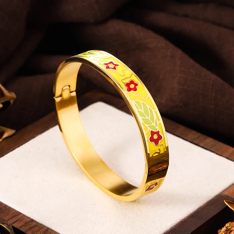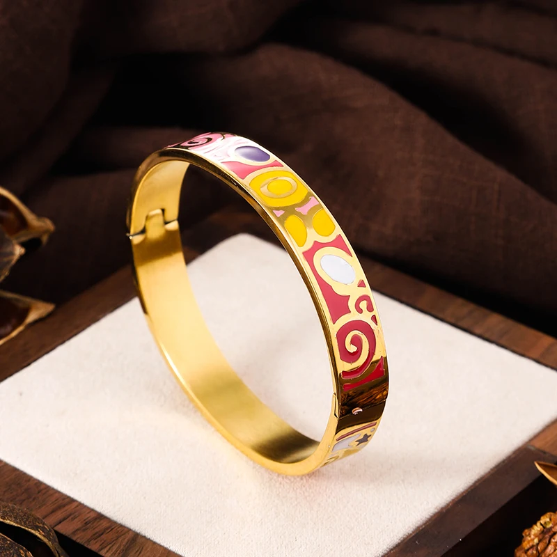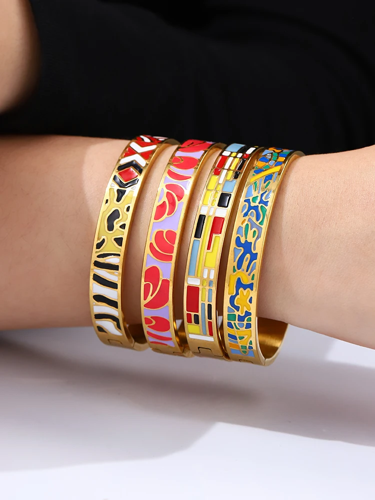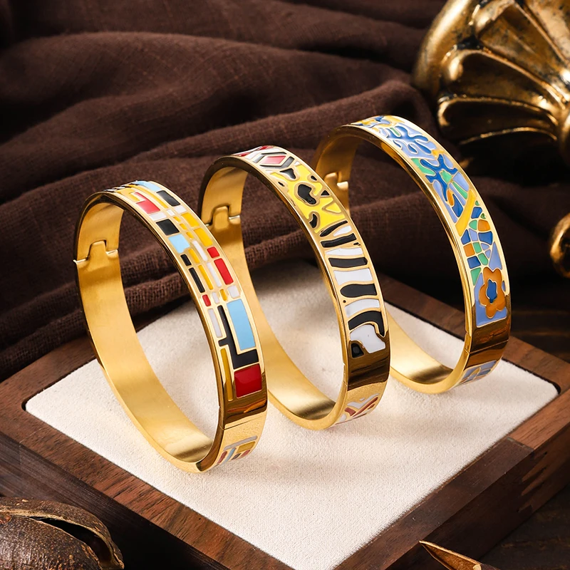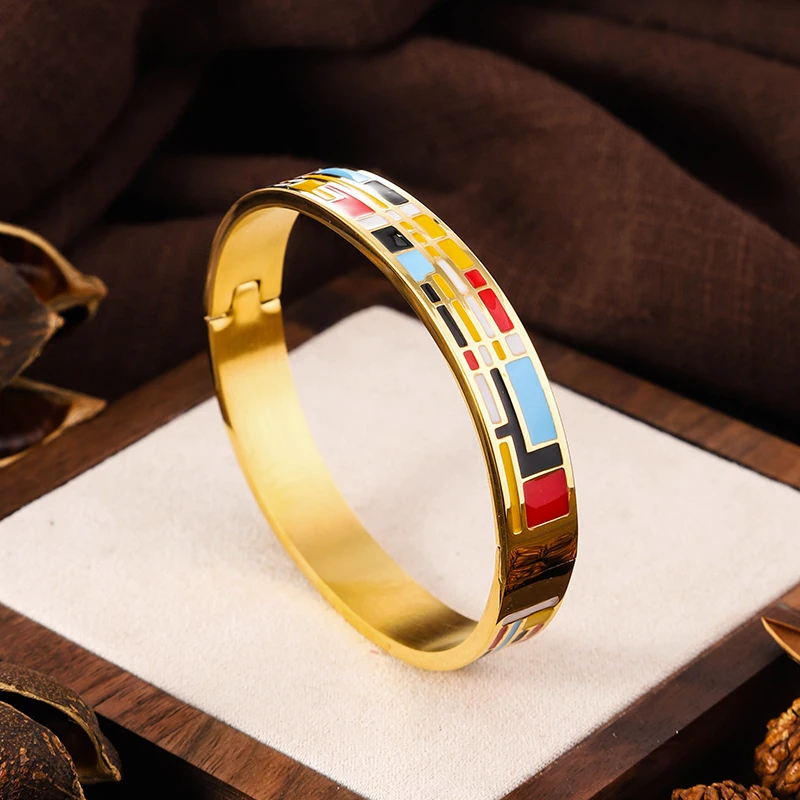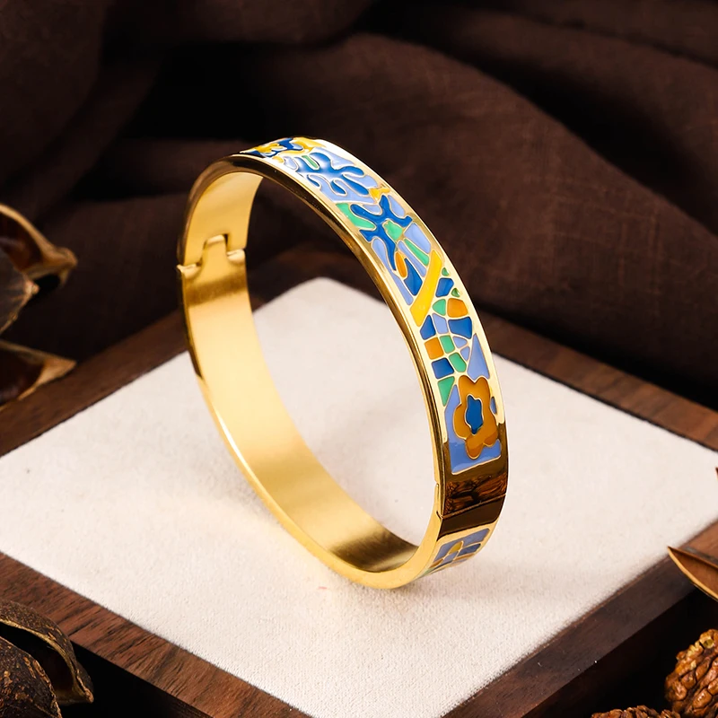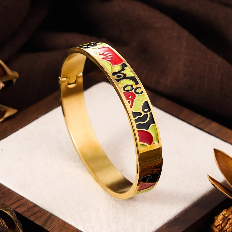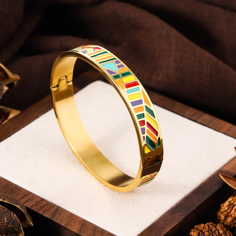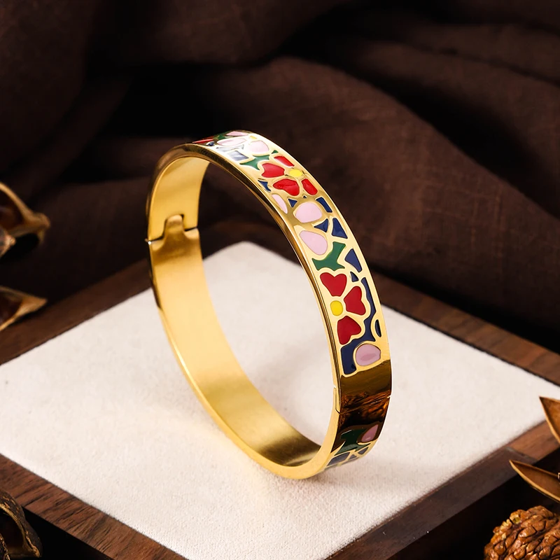 Add a splash of vibrant artistry to your daily look with this Vintage Gold Color Enamel Bracelet by ZHIRUI STAR. Crafted from high-quality stainless steel, this widened, openable bangle showcases exquisite enamel painting techniques and geometric patterns that reflect a fusion of European classics, Japanese-Korean sweetness, and ethnic-inspired charm.