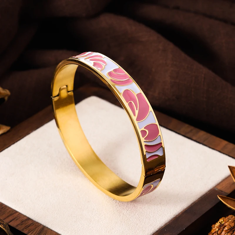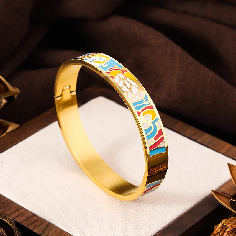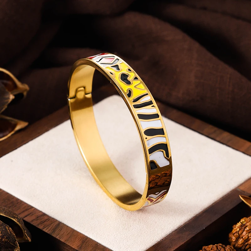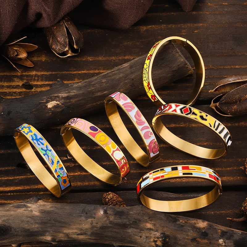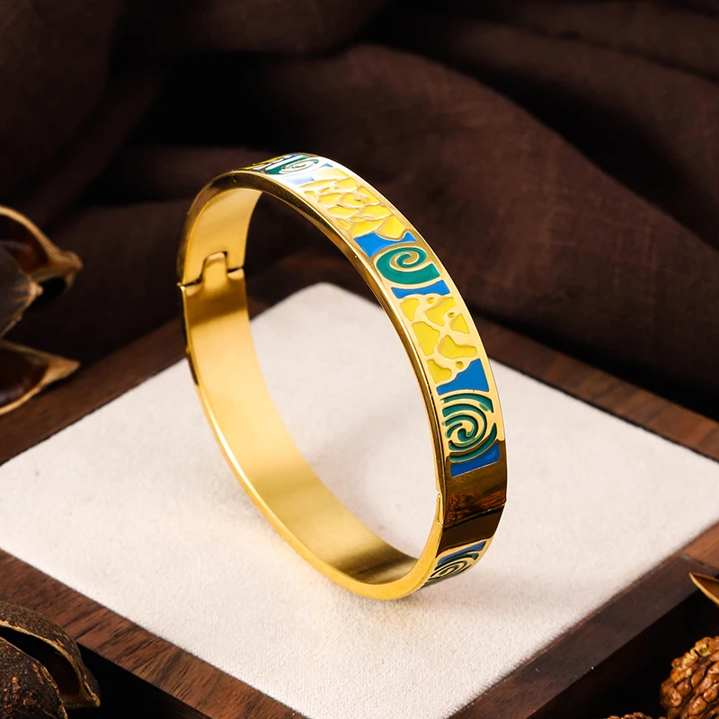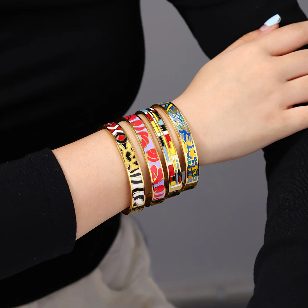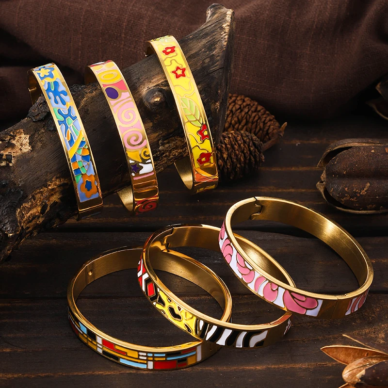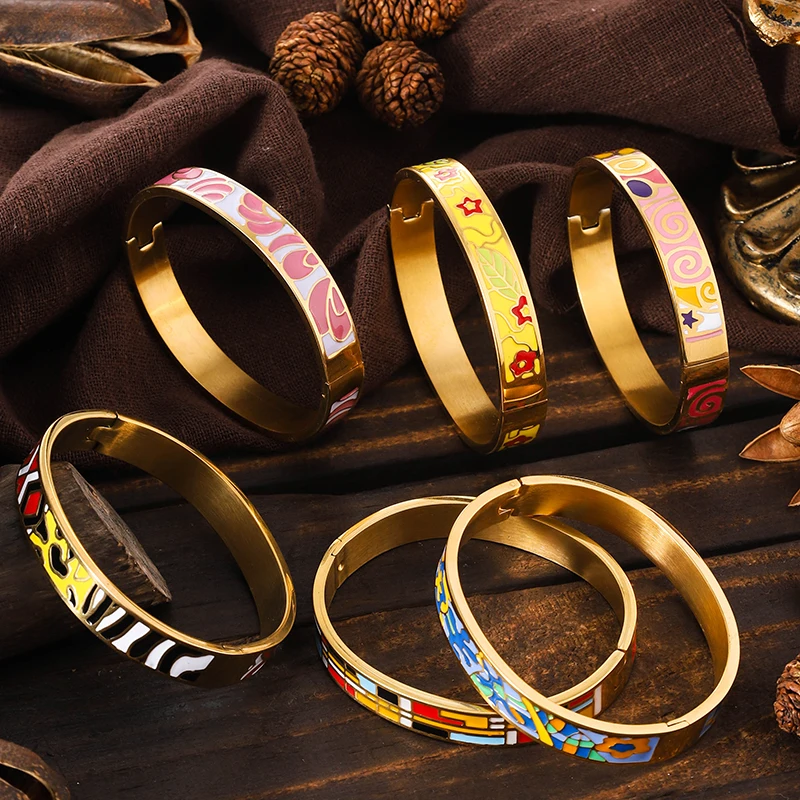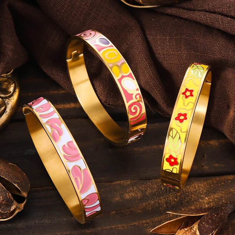 Add a splash of vibrant artistry to your daily look with this Vintage Gold Color Enamel Bracelet by ZHIRUI STAR. Crafted from high-quality stainless steel, this widened, openable bangle showcases exquisite enamel painting techniques and geometric patterns that reflect a fusion of European classics, Japanese-Korean sweetness, and ethnic-inspired charm.
